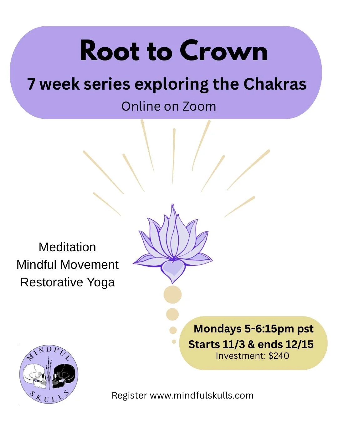 I am bringing my offerings online! Online classes can help strengthen or begin a home practice. We will gather online for 7 Mondays in a row beginning in November. Each class is going to focus on a different chakra, energy center in the body. In these sessions you can expect to learn about each of the 7 chakras and experience practices for each in your body. Practices will include meditation, mindful movement and restorative yoga. This is a an opportunity to be curious about yourself as we slip into these slower and more reflective months. You can register on my website www.mindfulskulls.com